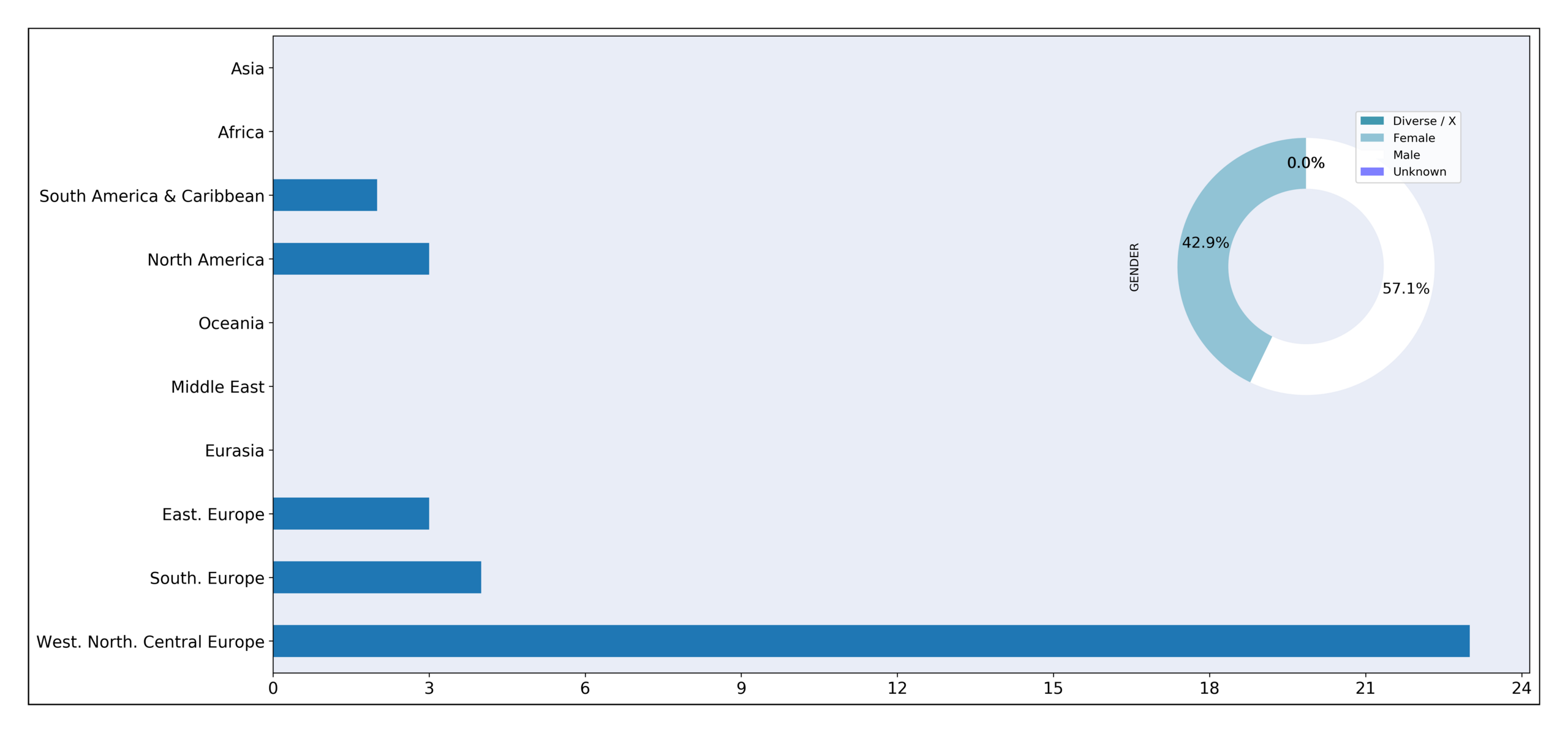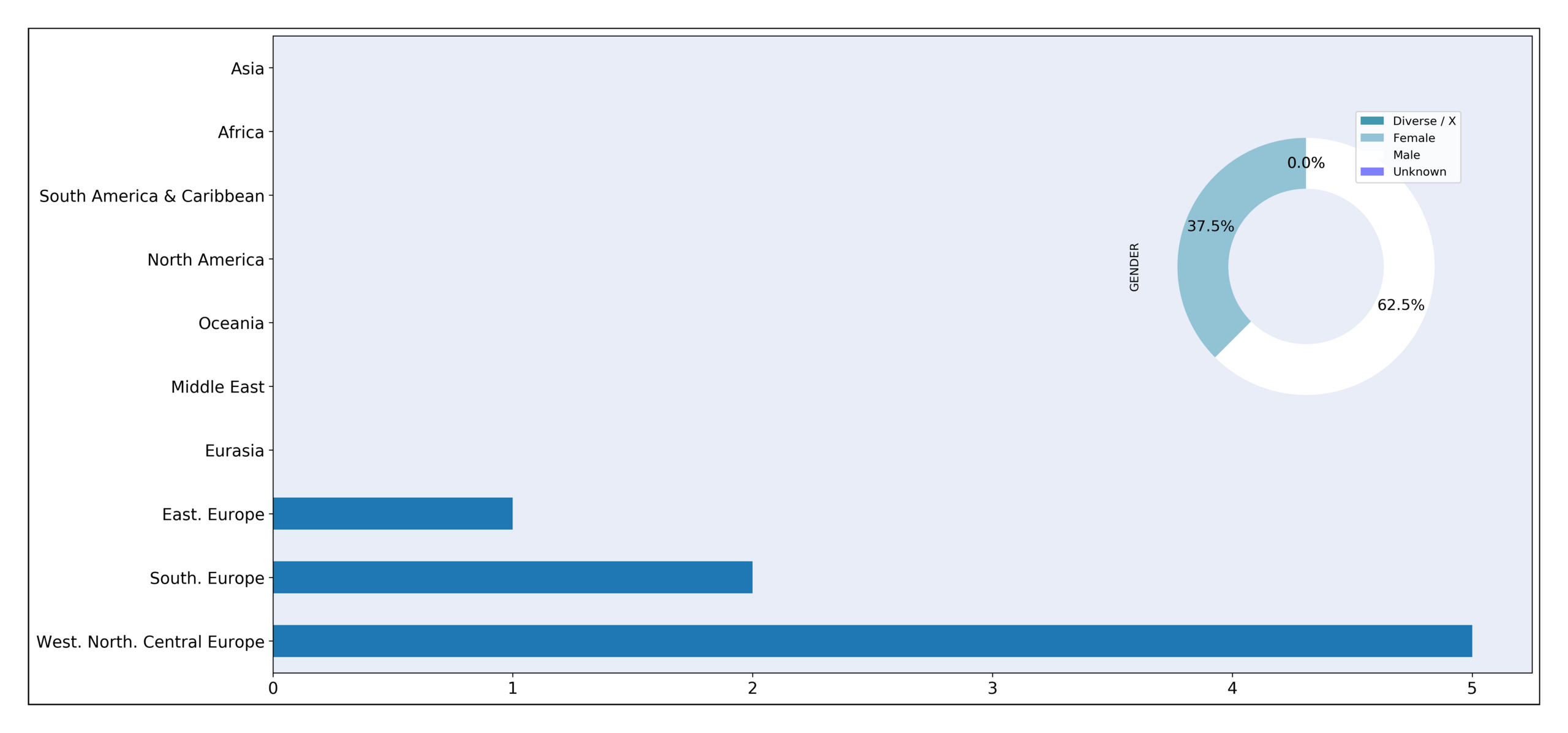 8 reviewers were involved in the reviewing process for NW 13. Country of origin and gender are portrayed in this graph.