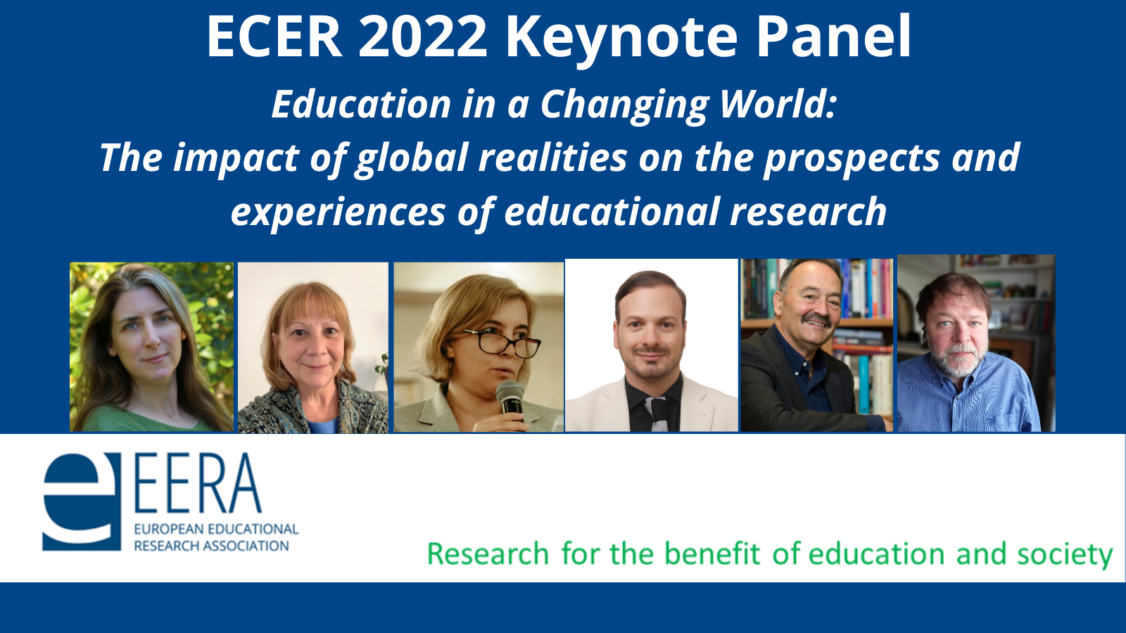 The theme of ECER 2022 is 'Education in a Changing World: The impact of global realities on the prospects and experiences of educational research'. At the EERA Panel, the ECER 2022 Keynote Speakers - Tracey Burns (OECD Centre for Educational Research and Innovation), Carole Faucher (University of Edinburgh), Maria Assunção Flores (University of Minho), Robert Khachatryan (Brusov State University), Bob Lingard (University of Queensland) and Eric Mangez (University of Louvain) - will discuss with each other and also enter into dialogue with the audience.